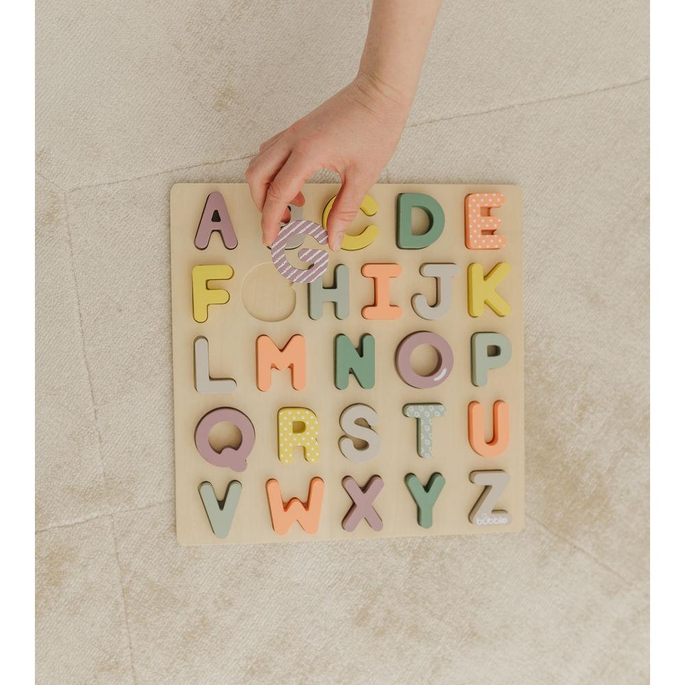 Introduce your child to the joy of learning with the Bubble Wooden Alphabet Puzzle. Crafted from high-quality, sustainably sourced wood, this engaging puzzle features 26 chunky, easy-to-hold letters that fit snugly into their corresponding slots. The vibrant colours and smooth finishes are designed to captivate young minds, making the journey through the ABCs both fun and educational